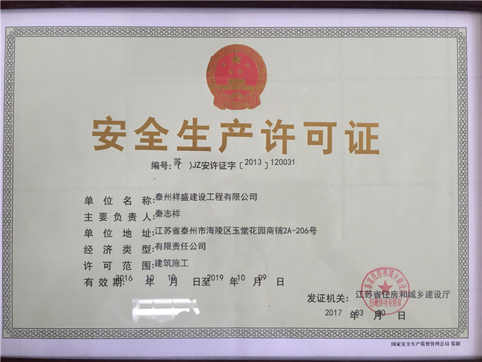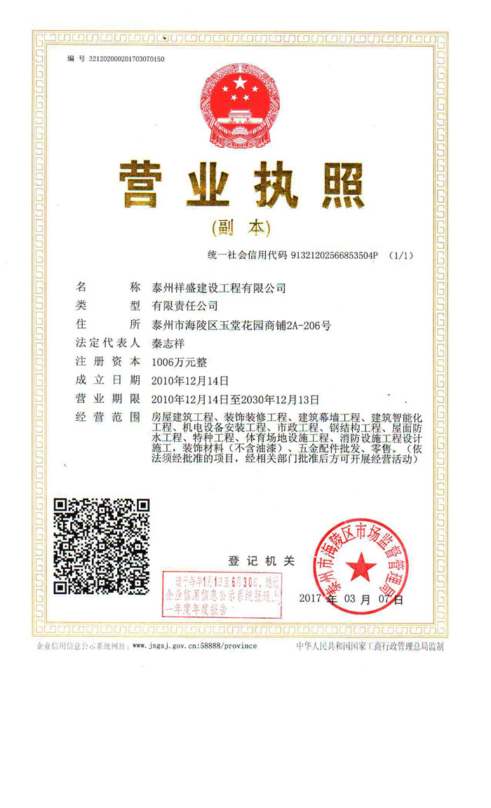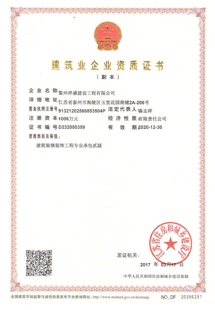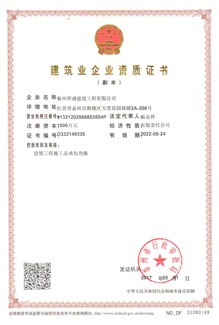 泰州祥盛建设工程有限公司成立于2010年12月,公司所在地泰州市海陵区。公司注册资本1006万元,公司原名称为泰州市祥盛建筑装饰工程有限公司,2017年3月经工商局核准名称变更为泰州祥盛建设工程有限公司。公司具国家级《建筑企业资质证书》、《安全生产许可证》等,是泰州地区建筑市场较有实力的优秀成长型企业。
